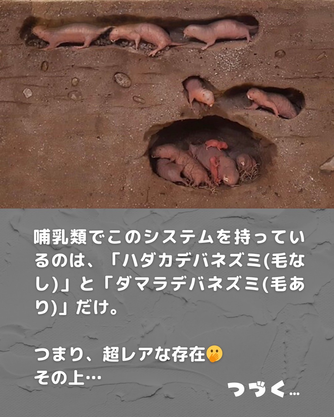 哺乳類でこのシステムを持っているのは、「ハダカデバネズミ(毛なし)」と「ダマラデバネズミ(毛あり)」だけ。