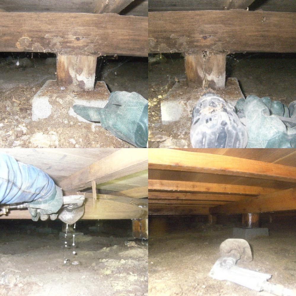 床下の高さが30cm未満でも、頑張ったら入れるお家は入っていきシロアリ被害部分に穴を開けていきます。 |